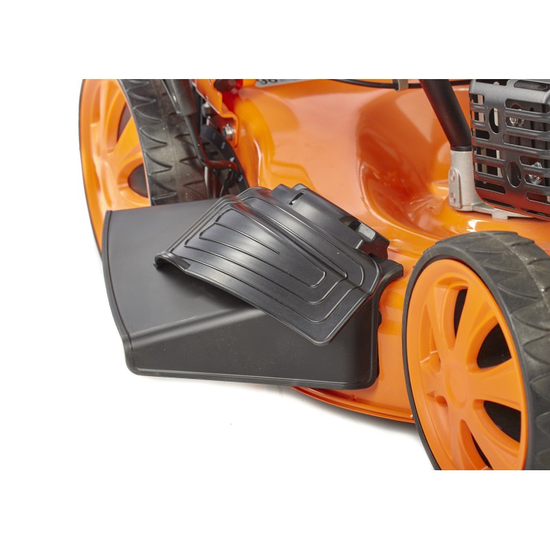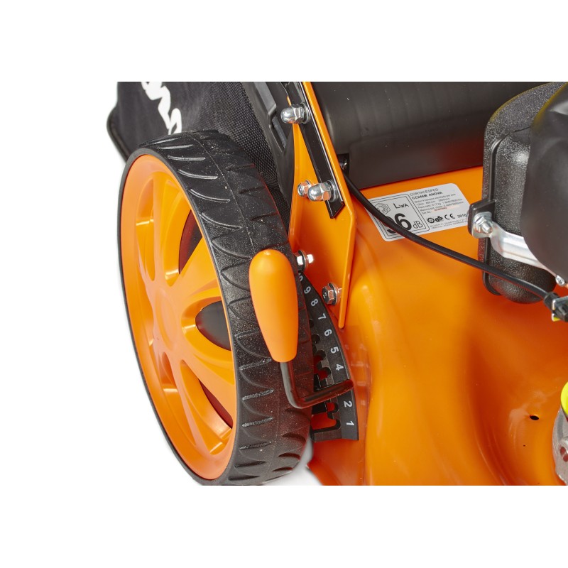 Este modelo cuenta con un sistema de plegado rápido, indicador de cesto lleno, ruedas traseras y delanteras grandes, de 11” y 8” respectivamente, sin olvidar la tracción, para no tener que empujar por la máquina segadora. Recomendado para superficies de entre300m² y 500m²