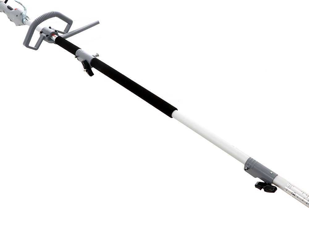 La robustez está garantizada por una transmisión de barra rígida de 26 mm, divisible en dos piezas para facilitar el transporte. Este modelo profesional no solo destaca por su potencia, sino también por su alcance: con el accesorio de podadora de cadena, alcanza una longitud total de 287 cm, permitiendo trabajar en copas de árboles de forma segura desde el suelo. Además, viene acompañada de un equipamiento de protección y confort inusual en su categoría, incluyendo un arnés profesional de dos hombros.